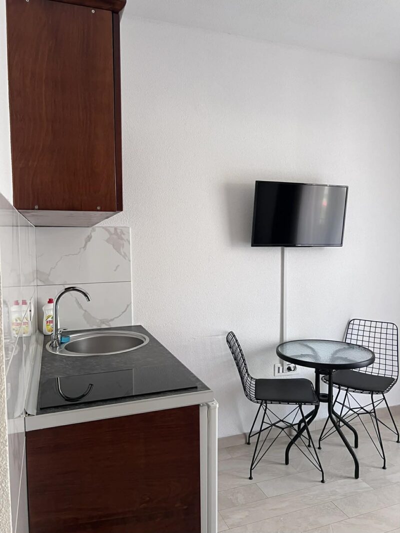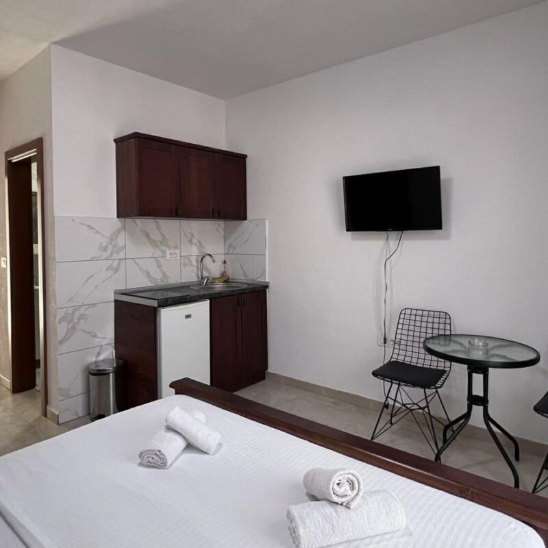 Apartamentowiec  dysponuje apartamentami dwuosobowymi, trzyosobowymi i czteroosobowymi . Każdy apartament posiada aneks kuchenny oraz łazienkę. Aneks kuchenny wyposażony jest w płytę grzewczą, lodówkę i przybory kuchenne. Wszystkie pokoje posiadają balkon z widokiem na morze. Klimatyzacja dostępna jest we wszystkich apartamentach . Na miejscu dostępny jest darmowy Internet Wi-Fi. Doba hotelowa zaczyna się o 14:00, a kończy o 10:00.