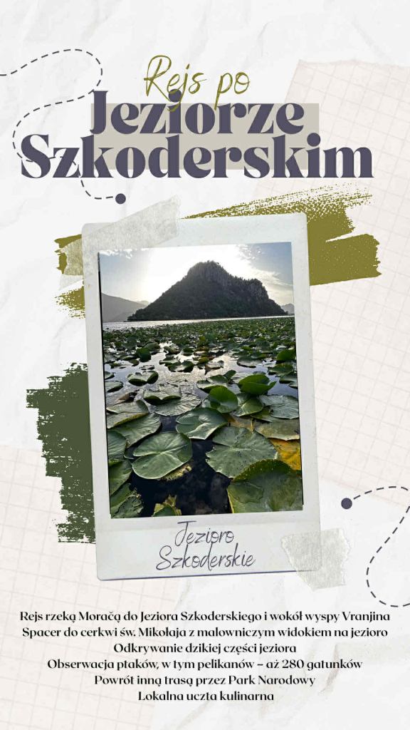 - Rejs po Jeziorze Szkoderskim największym jeziorze na Bałkanach, bajeczne widoki, rozlewiska jeziora oraz mnóstwo ptaków , które żyją w tym jeziorze. Na zakończenie rejsu obiad u kapitana w domu . Na obiad serwowany karp z Jeziora Szkoderskiego z przystawkami i degustacja wina.